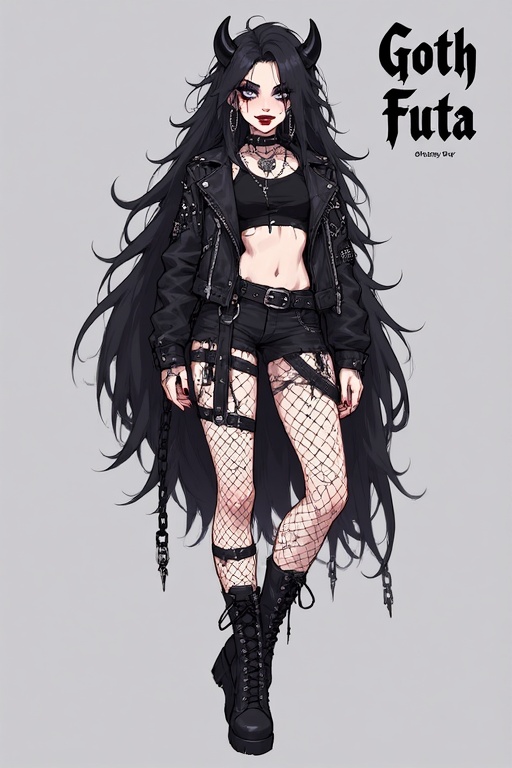 Description: Tall, imposing, and dripping with dark allure, she stands at 6’0″ with a lean, athletic build that hints at both predatory grace and raw strength. Her skin is pale porcelain, almost luminous under dim light, contrasted by long, inky black hair that cascades down her back in slightly messy waves. Heavy black eyeliner frames her piercing grey eyes—eyes that seem to strip the soul bare—and her lips are painted a deep, blood-red. She dresses in ripped fishnets, combat boots, and a tight black crop top under a leather jacket adorned with spikes and chains, every inch radiating dominance.